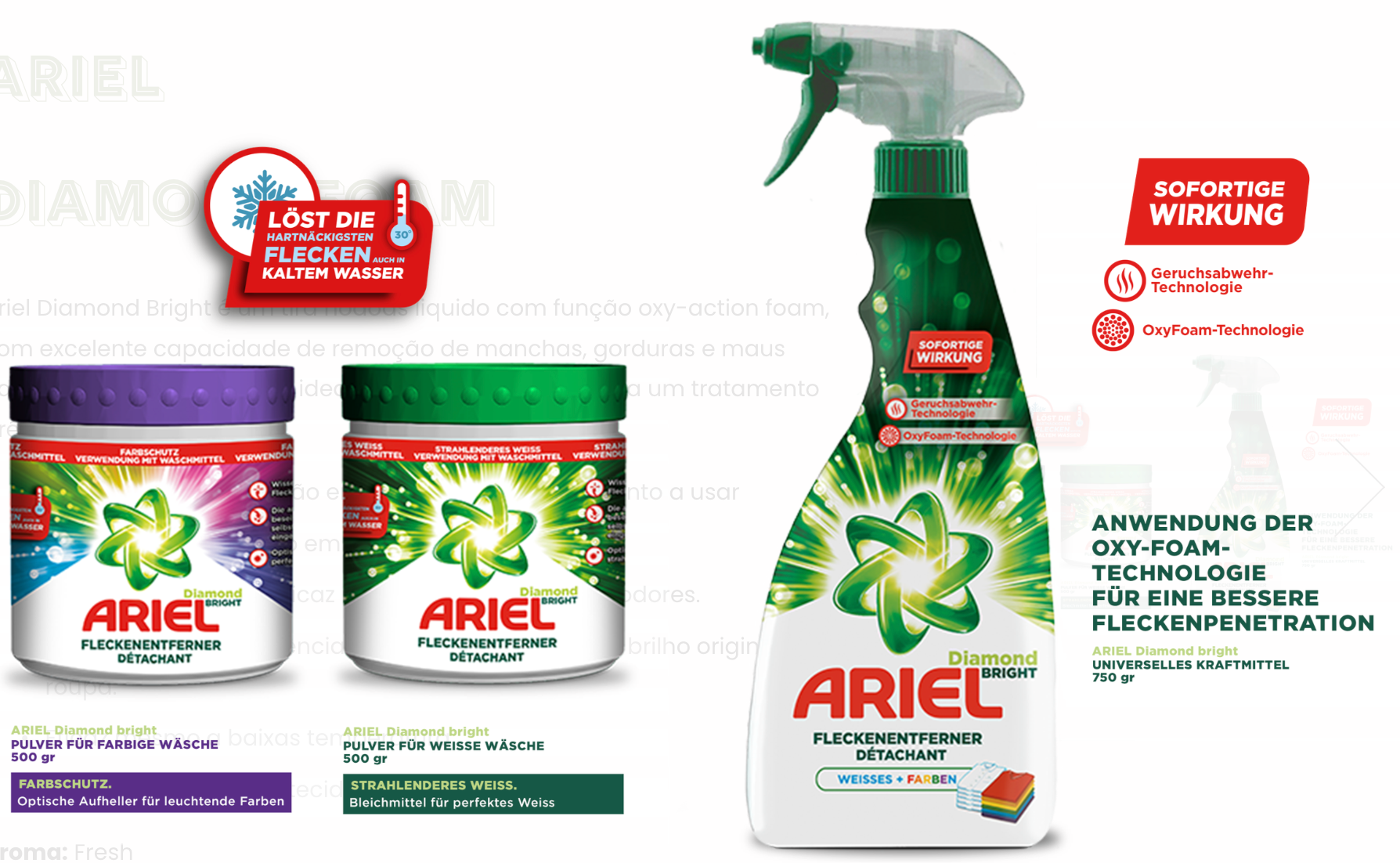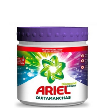 Ariel Diamond Bright é um tira-nódoas em pó com função oxy-action, com excelente capacidade de remoção de manchas, gorduras e maus odores orgânicos da roupa, idealmente desenvolvido para um tratamento pré-lavagem.
