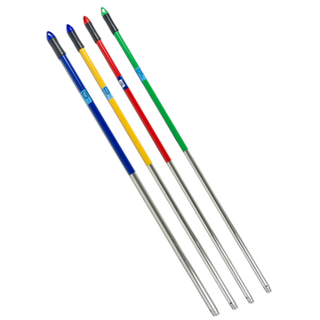Cabo profissional em alumínio, parcialmente forrado a plástico colorido.