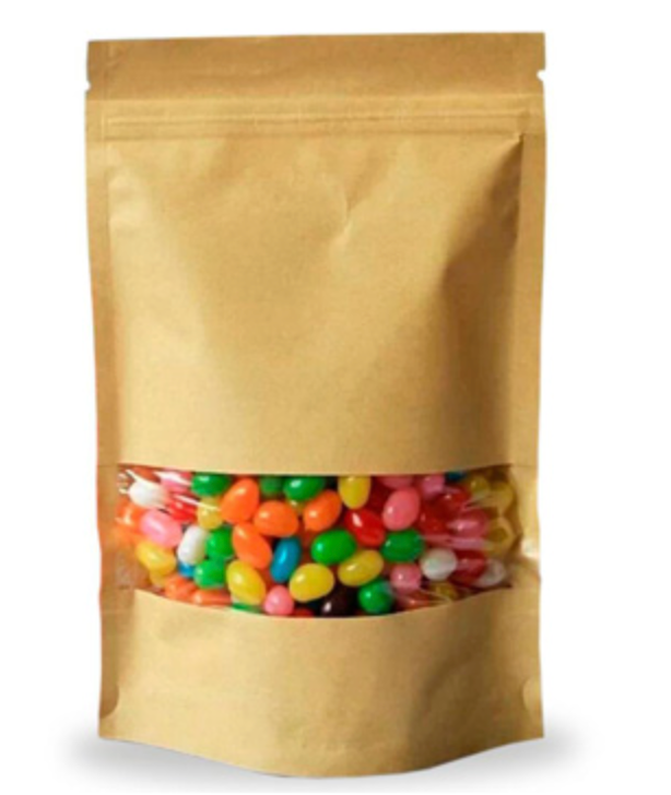 Saco kraft, com fecho zip e uma janela em plástico para visualização do seu conteúdo.