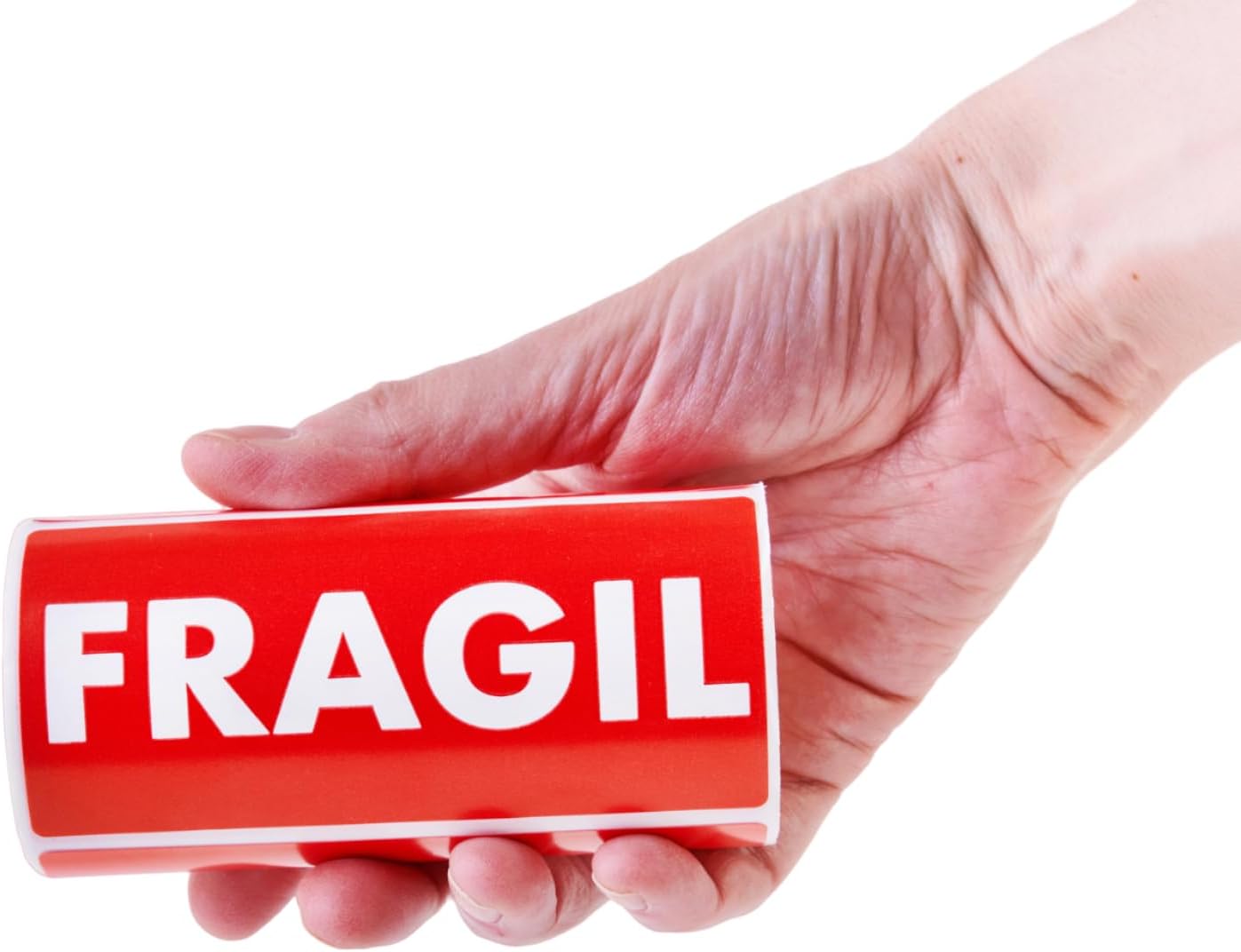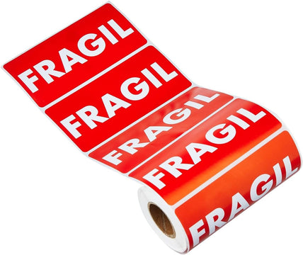 Rolo de etiquetas adesivas de cor vermelha impressas em branco com a palavra "FRAGIL".