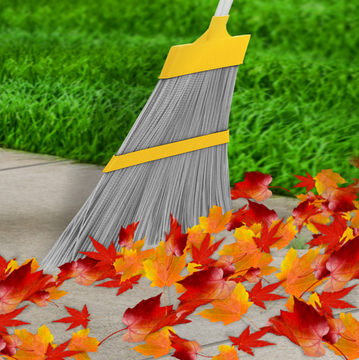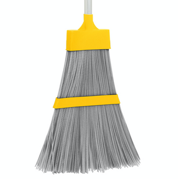 Vassoura para exteriores, com cerda longa em plástico extra resistente e um cabo telescópico extensível, leve e resistente.