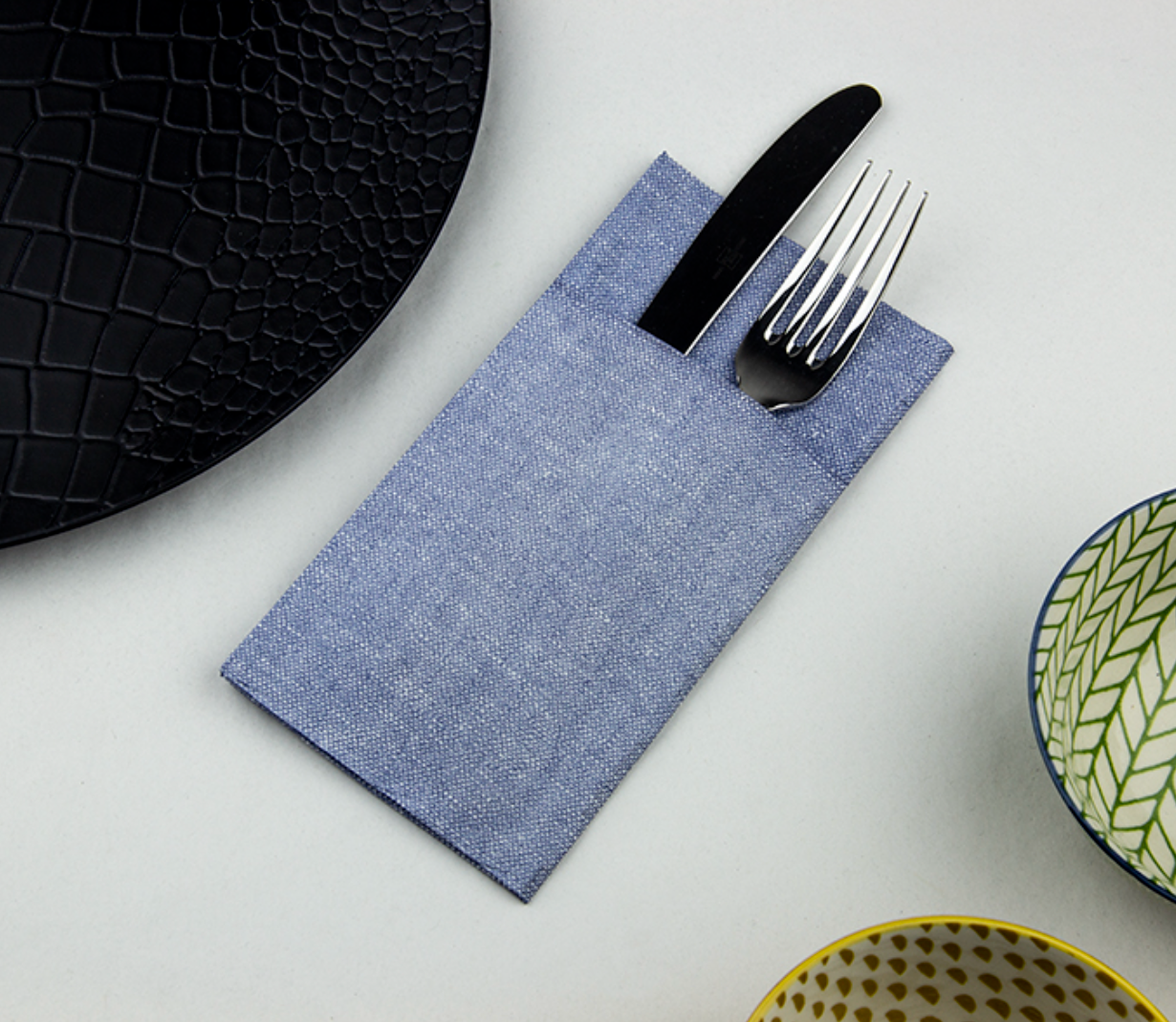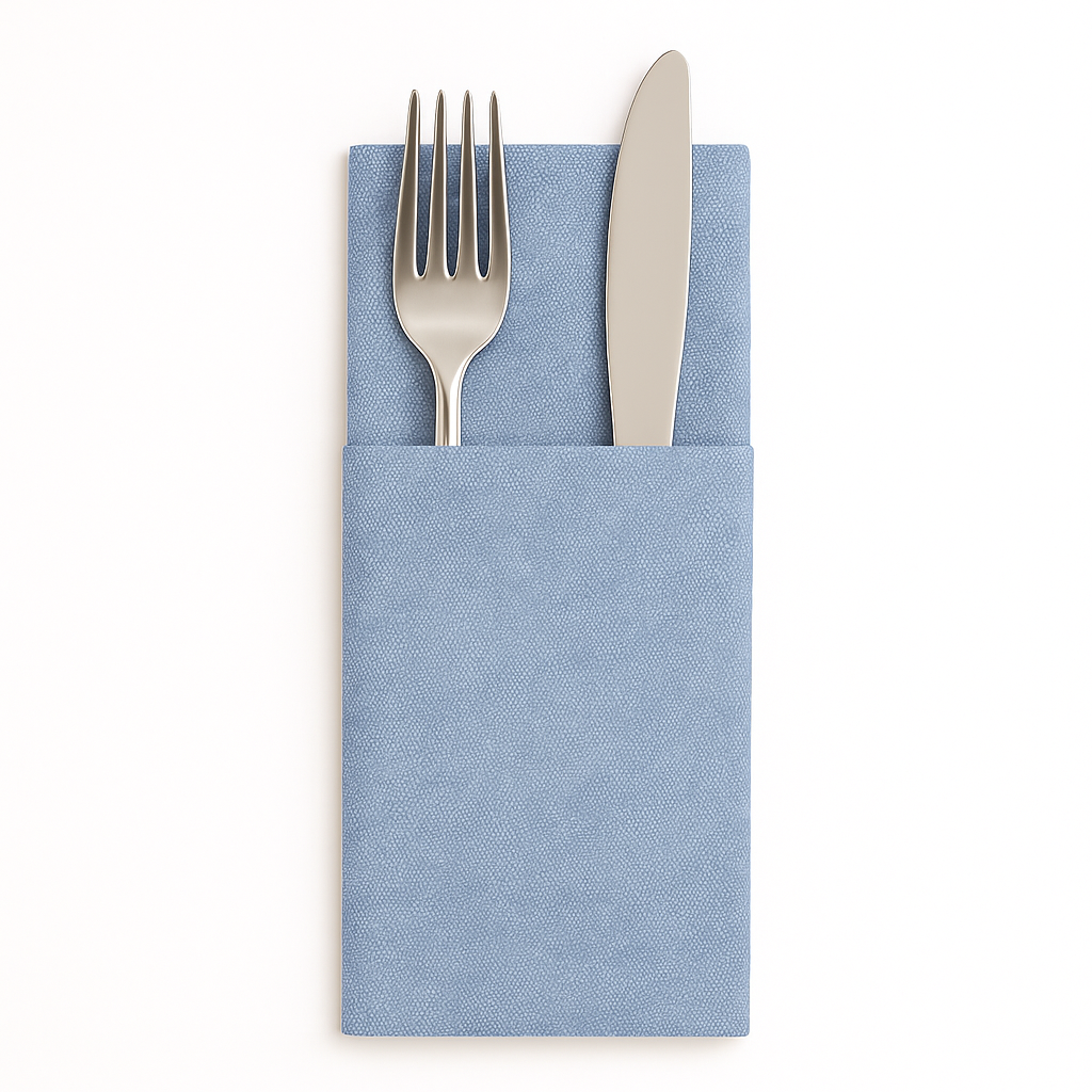 Guardanapo dobrado em 1/8, com bolsa porta talheres. Formato super prático pronto a colocar na mesa.