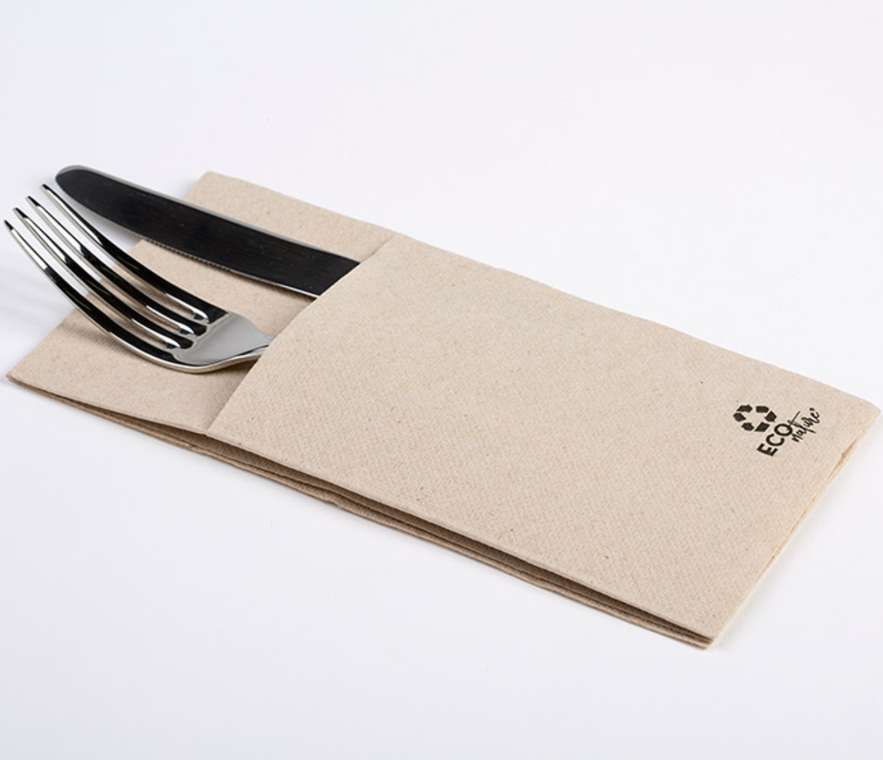 Guardanapo dobrado em 1/8, com bolsa porta talheres. Formato super prático pronto a colocar na mesa.