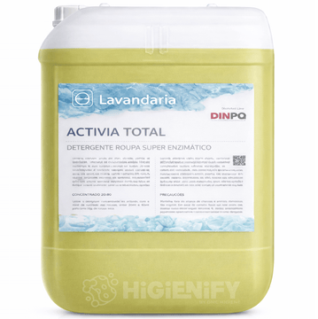 Dinpq Activia Total é um detergente líquido máquina roupa industrial super enzimático, concentrado de alto rendimento, reforçado com poder humectante que lhe confere um elevado poder tira-nódoas.