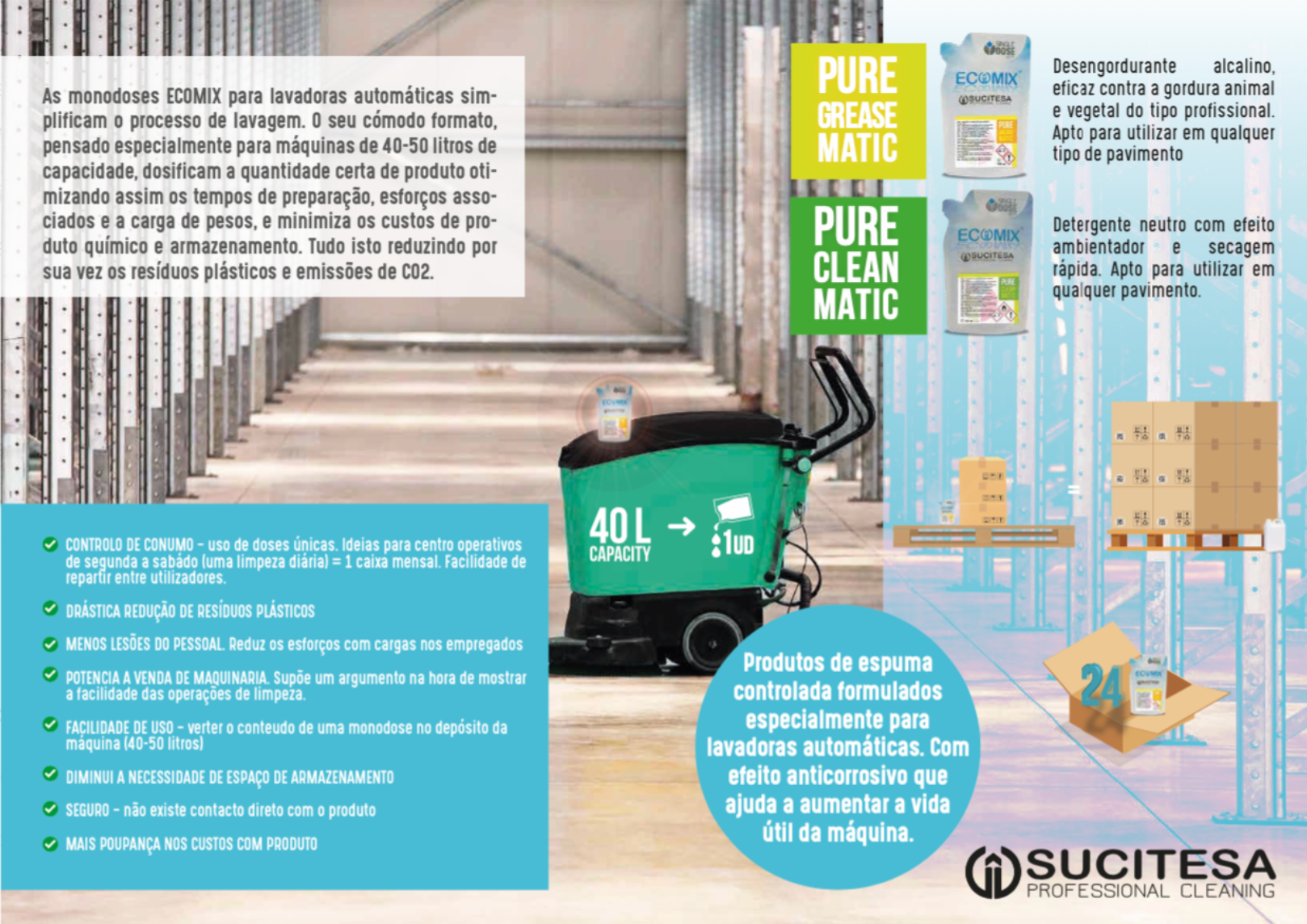Ecomix Pure Greasematic é um detergente alcalino de baixa espuma, superconcentrado, desenvolvido para a lavagem diária e manutenção de pavimentos com elevado nível de sujidade, através de máquinas auto-lavadoras.