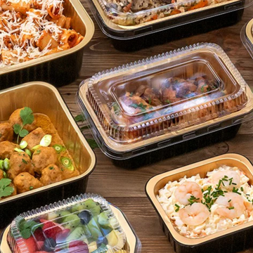 Embalagem para Take Away com revestimento lacado de cor, de base preta e com acabamento interior dourado.