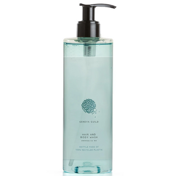 Geneva Guild Hair & Body Wash é um gel de banho e champô, de qualidade cosmética, enriquecido com extratos naturais de aloé vera e melissa.