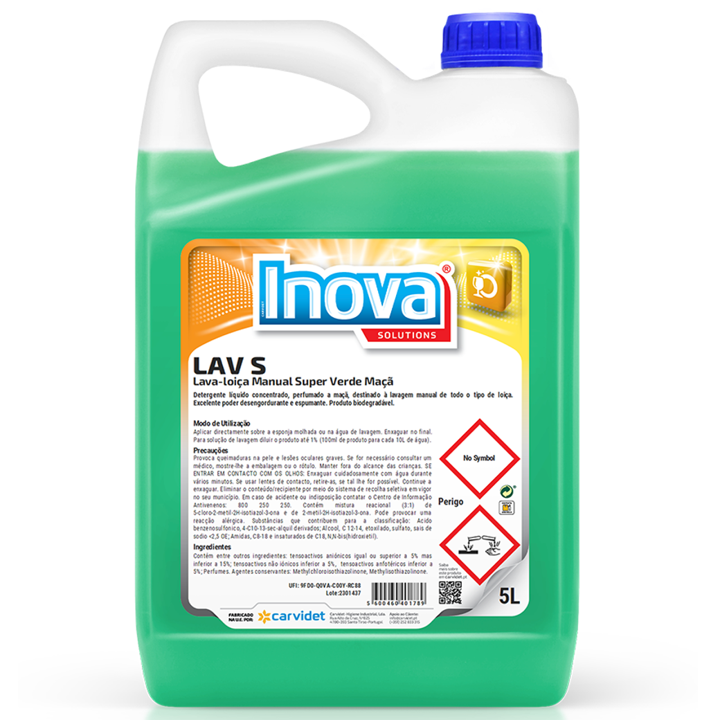 LAV S é um detergente de loiça indicado para a lavagem manual de todos os utensílios normalmente utilizados nas cozinhas profissionais.