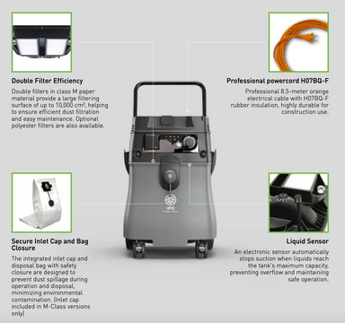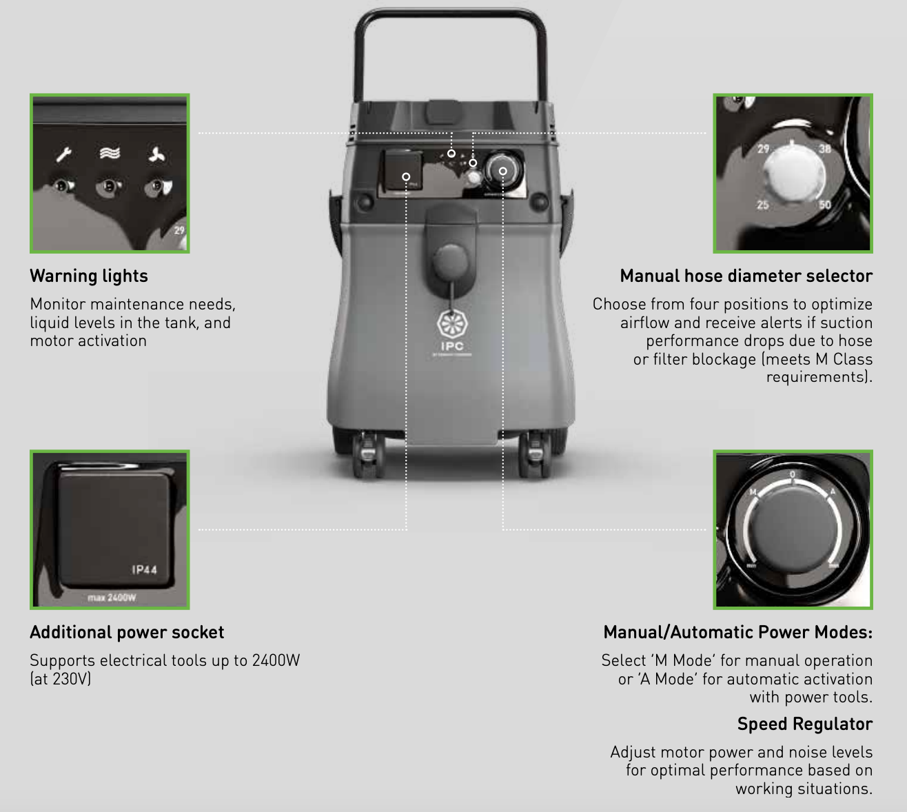 - Super Versátil. Adequado para a aspiração de poeiras sólidas ou líquidos. Regulador de velocidade e ruído, muito fácil de ajustar. Possui igualmente uma tomada interna de 2400W que permite a integração de ferramentas de construção como rebarbadoras, berbequins ou polidoras.