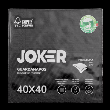JOKER 40x40 2F PPP PRETO é um guardanapo de mesa premium, folha dupla PPP (Ponto por Ponto), desenhado para restaurantes e serviços de catering que pretendem dar cor e diferenciação á sua mesa.