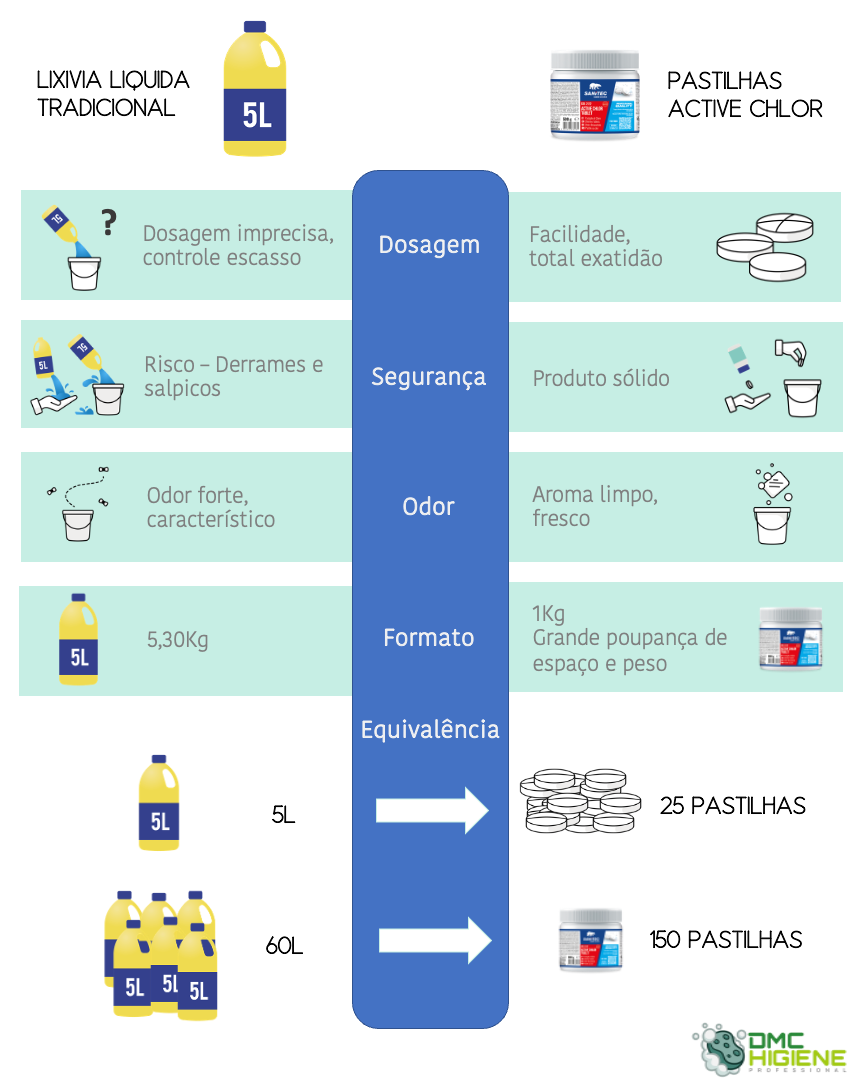 Active Chlor Tabs são umas pastilhas efervescentes cloradas, multifuncionais, desenvolvidas para limpeza e higienização de pavimentos e superfícies ou até mesmo desinfeção de frutas e verduras.