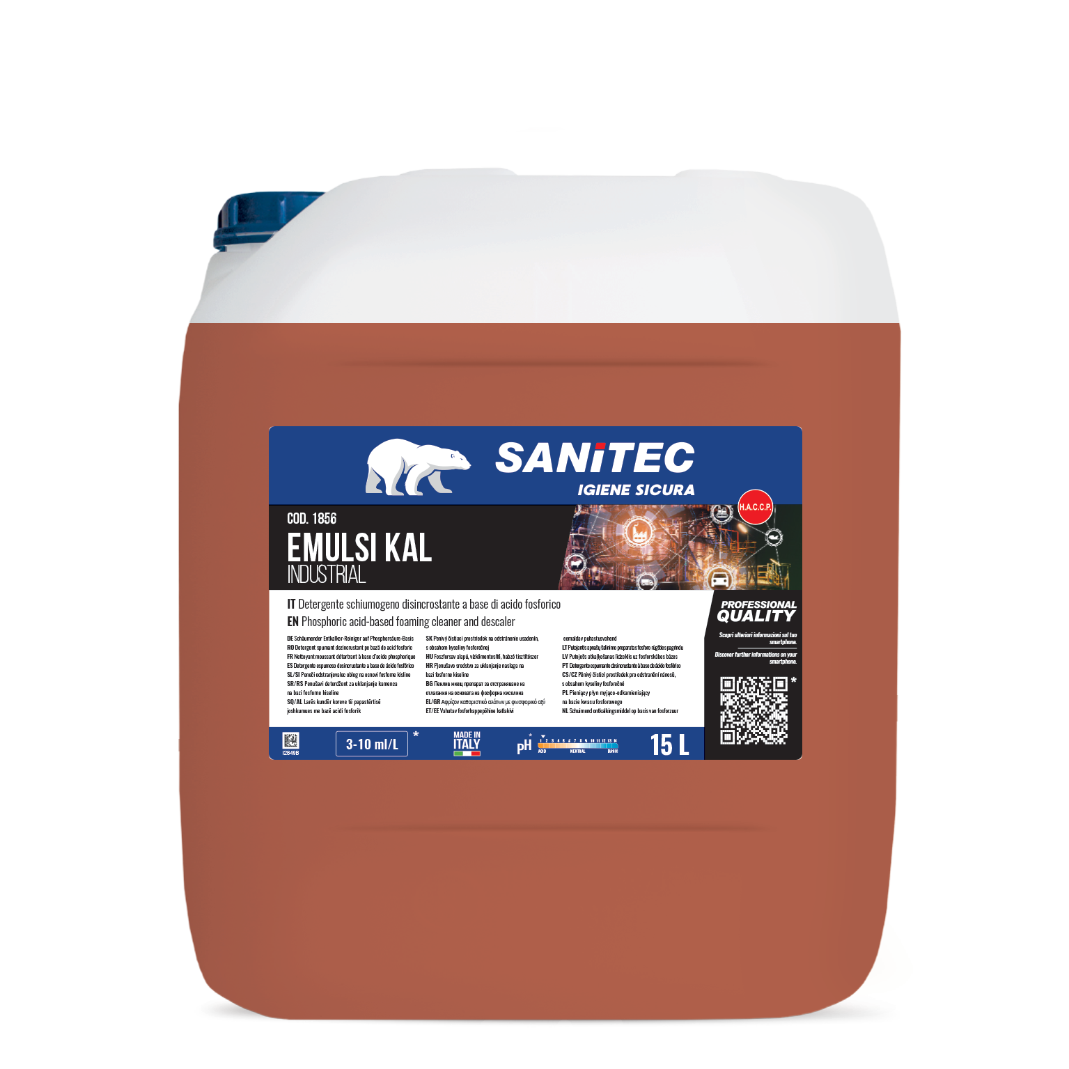 Emulsi-Kal é um detergente espumante ácido com alto teor de ácidos inorgânicos, tensioativos de limpeza e surfactantes de alta eficácia, desenvolvido para limpezas periódicas em sistemas de projeção na indústria agro-alimentar.