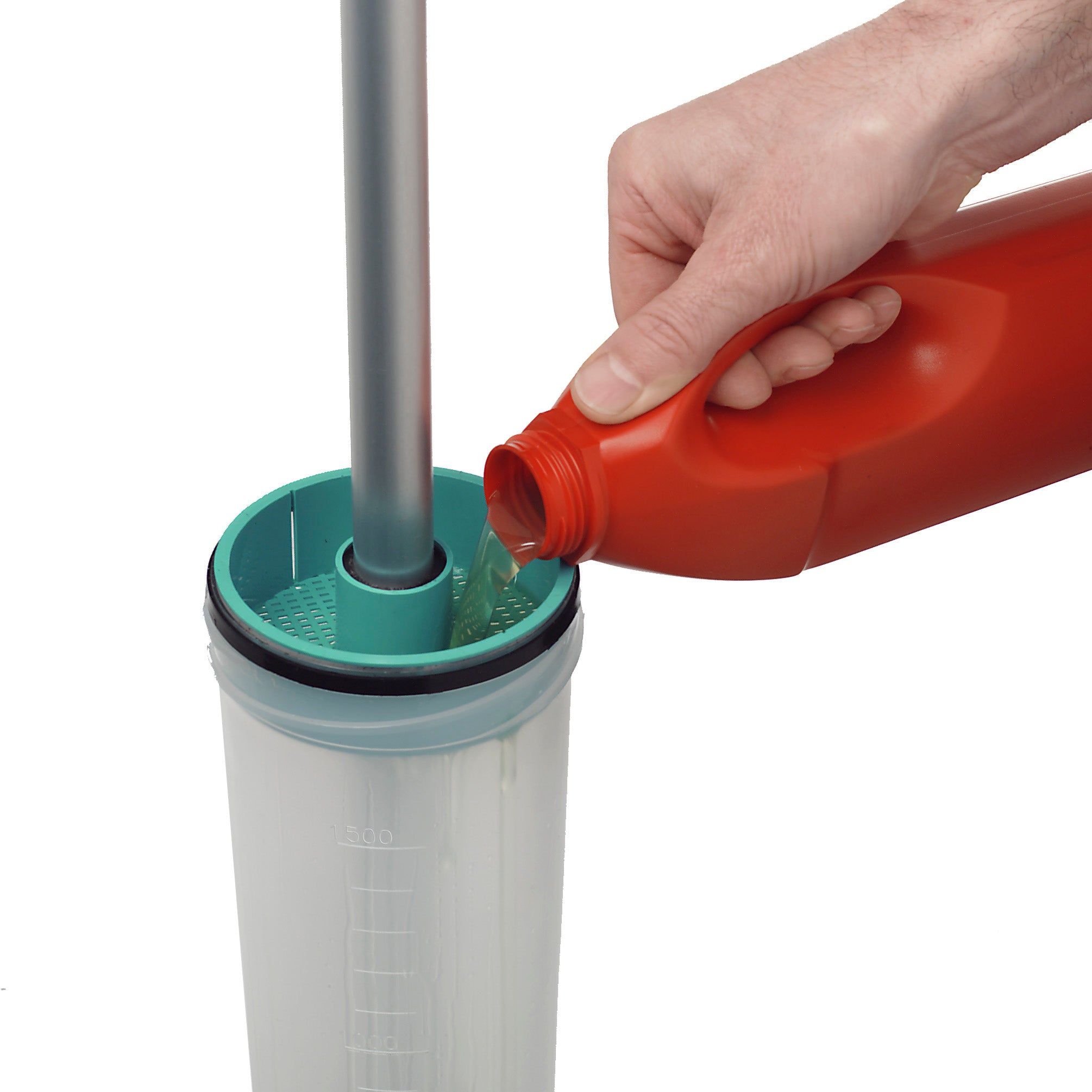 Preciso: O cabo com depósito de 1,5L debita a quantidade suficiente pelo método spray diretamente para o pavimento, permitindo uma dosagem perfeita, poupança de tempo, de trabalho e uso de químico em excesso.