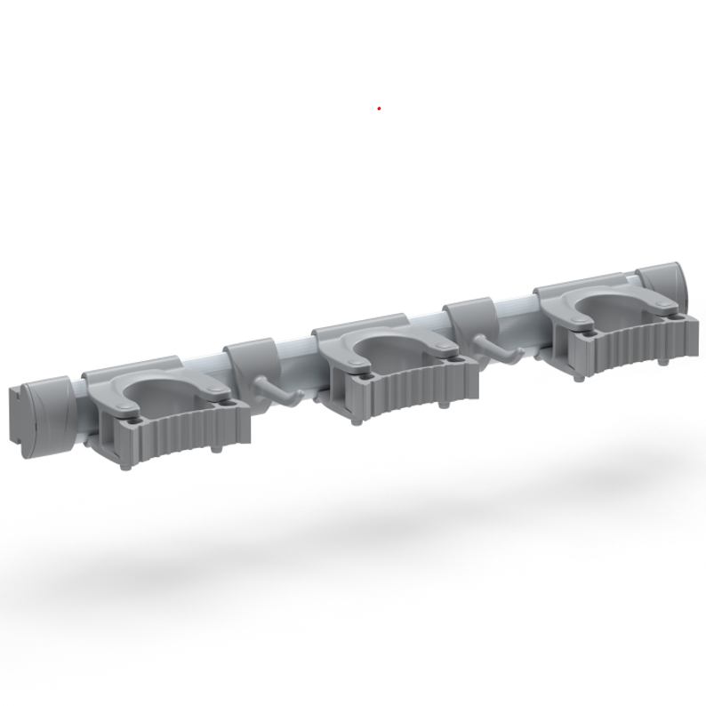 TTS Tools Bar é um prático suporte de utensílios de limpeza ergonómico, completo com 3 pegas para cabos e 2 ganchos para utensílios. Inclui ainda um kit de parafusos necessário à sua instalação em parede.