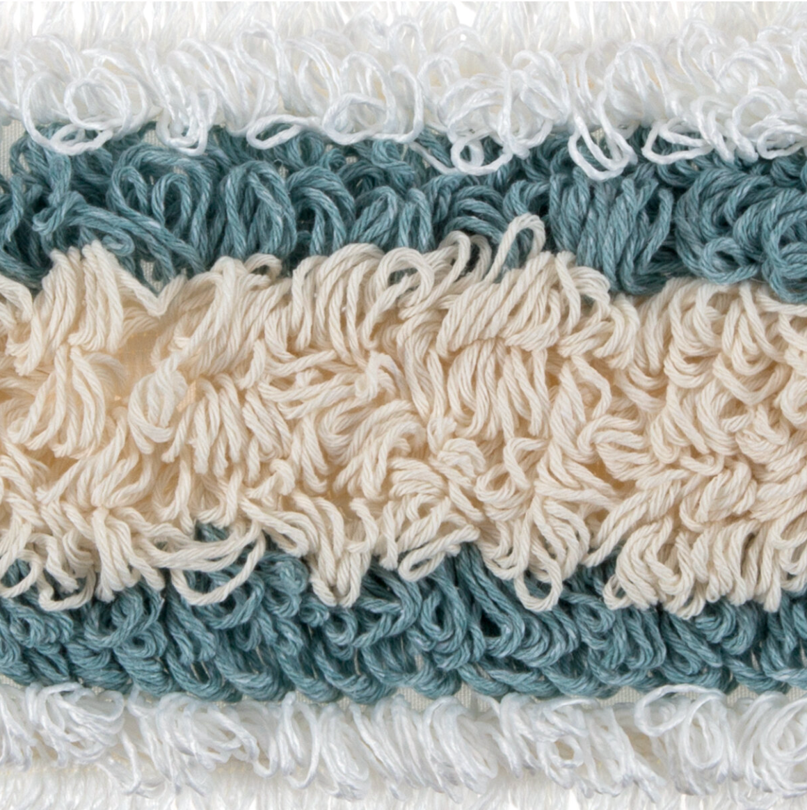 Franjinha numa combinação têxtil de microfibra, poliéster e algodão.