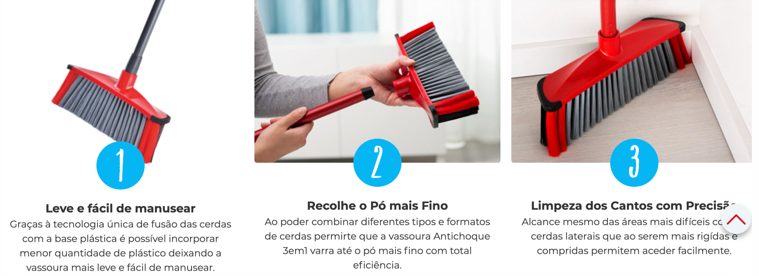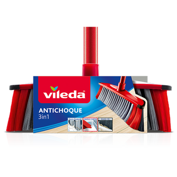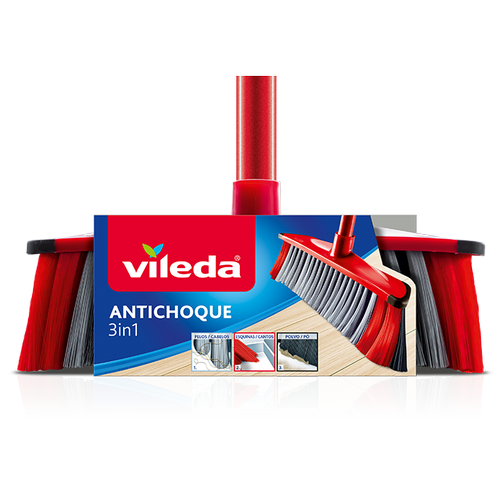 A vassoura Vileda Antichoque 3em1 é a única do mercado produzida com a mais avançada tecnologia em vassouras. Esta tecnologia permite combinar 3 tipos de cerdas diferentes, com diferentes formas e inclinações que maximizam a limpeza numa só passagem!